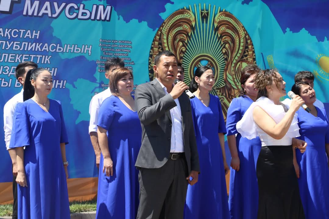 Жиын соңында аудандық мәдениет үйінің өнерпаздары «Көк тудың желбірегені» әнін жанды дауыста орындап, көпшіліктің ыстық ықыласына бөленді.